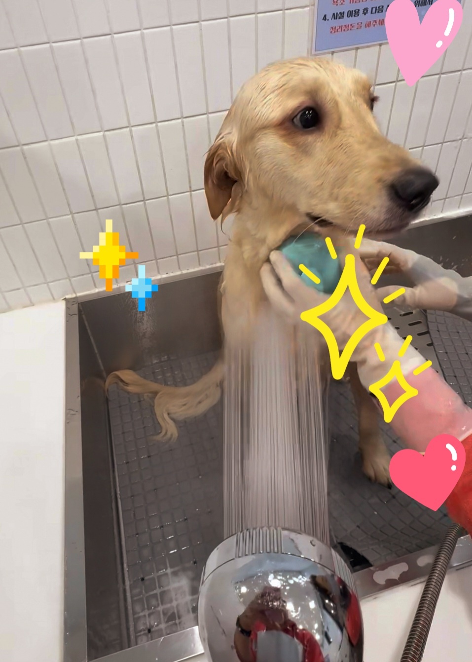 📌 골든리트리버는 털이 많아 물이 쉽게 스며들지 않아요. 충분히 적신 후 샴푸하세요!